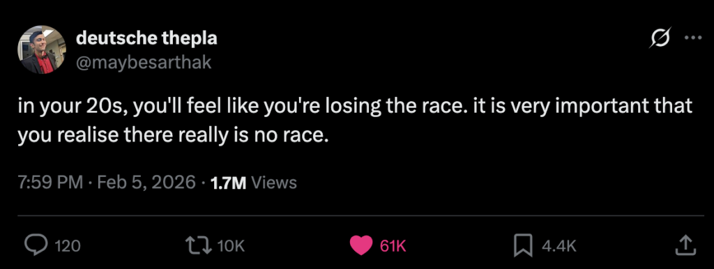 As I internalised the reality of reaching ‘unc status’ now that I was 30, I realised that I had already done all the hand-wringing I possibly could about being 30. Every possible form of media that you see constantly pushes this idea that the 20s are the ‘prime years of your life’, that it is your peak, and that you should not waste it. If you were to speed-run a decade of your life, this was meant to be it.